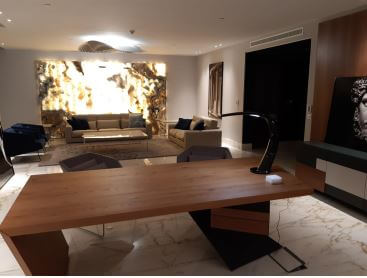 Flooring and coffee tables in calacatta gold and onyx cladding