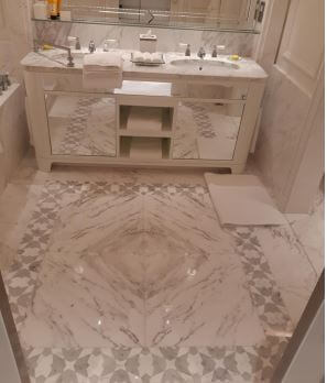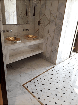 Vanity and claddding in calacatta with brass inserts & waterjet design flooring